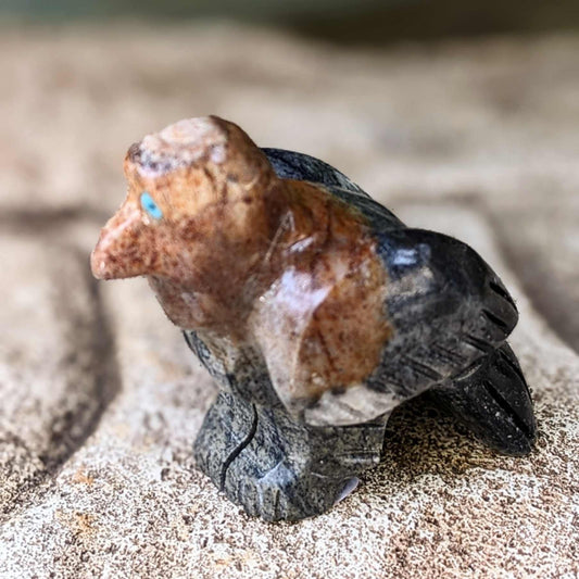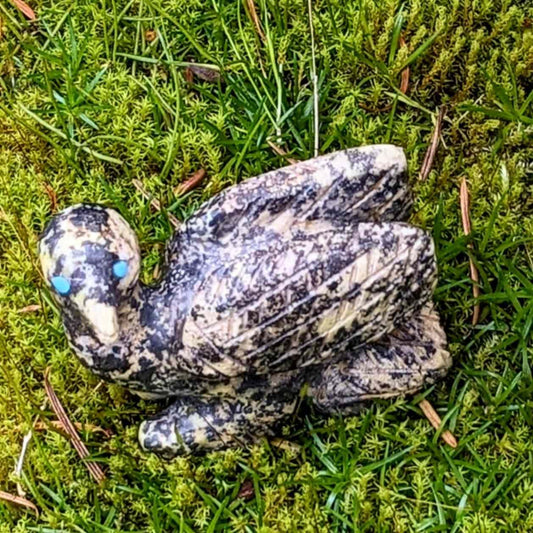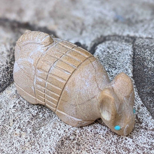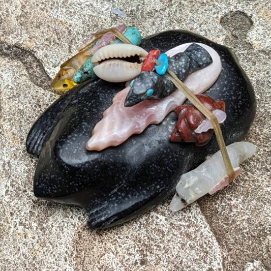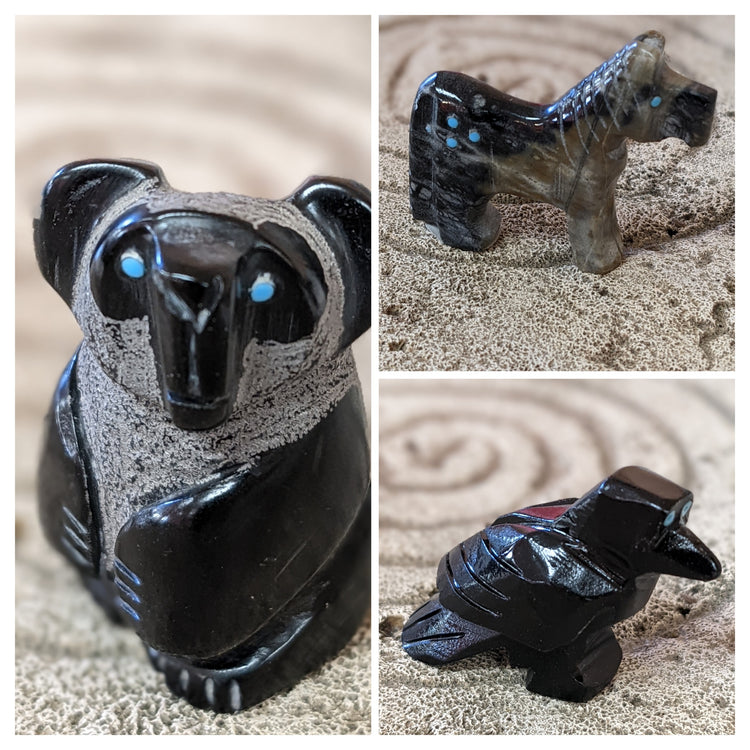 The Native American People of the Southwest have made and used fetishes for centuries and the Zuni people have been the suppliers of these personal amulets to other southwestern tribes for generations. A fetish is thought to bring good luck, and if treated properly and with veneration, will help or give power to its possessor. Made from primarily stone but also shell, fossils, and other materials, these small carvings serve ceremonial purposes for their creators and depict animals and icons integral to their culture.