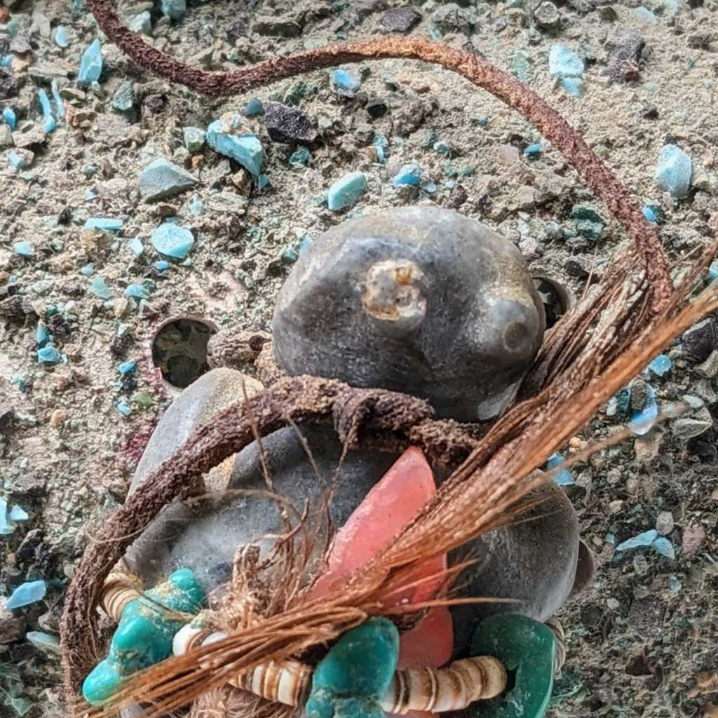 This collectible Zuni fetish pot by Mary Tsikewa (daughter of famed carver Teddy Weahkee) beautifully blends tradition and artistry. Eight fetishes adorn the vessel—four encircling the top and four fox carvings along the lower band—each carefully affixed with leather with turquoise, heishi beads and feathers. In Zuni belief, the fox symbolizes guidance and protection, giving this piece both cultural depth and spiritual meaning. The pot is encrusted with turquoise chips.